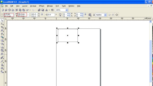Hình 1-Vẽ 1 hình chữ nhật 90 x 57 cm và đặt tọa độ ở vị trí x = 52.5 y = 267 mm ( lớn hơn khổ thẻ chuẩn chiều dài là 2mm chiều rộng 1.5 mm vì phải cắt bằng máy dập) hình 2.