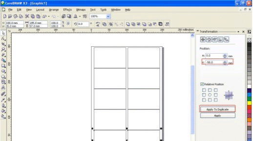 Hình 2- Chọn hình chữ nhật, nhấn Alt + F7 để nhân hình. Ta cho thông số H = 95 click duplicate để nhân hình ngang, chọn 2 hình chữ nhật cho thông số V = 58 và click duplicate để nhân hình xuống đưới cho đến khi đầy trang giấy hình 3.