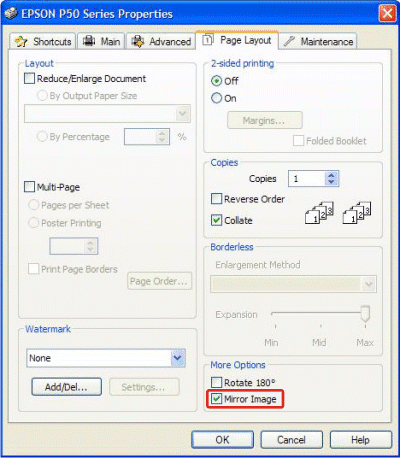 – In hình vào lớp mỏng của PVC (có 2 mặt), in vào mặt không bóc được, in ngược: Page Layout –> chọn Mirror Image (hình 4), máy sẽ tự động in ngược.