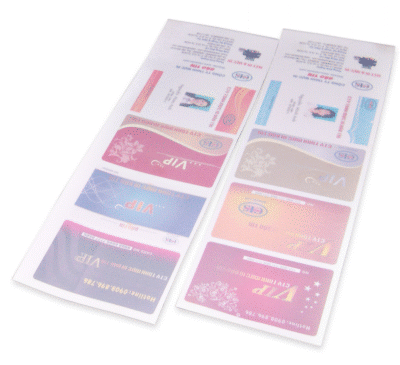 – Dùng dao hoặc kéo cắt tấm PVC thành 2 phần (hình 5), sau đó dùng máy bế Card để bế ra tứng cái (hình 6).